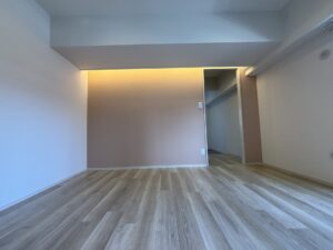 優しい暖色系のデザインクロスと柔らかな光を演出する間接照明で、落ち着きのある素敵なお部屋に仕上がっています。